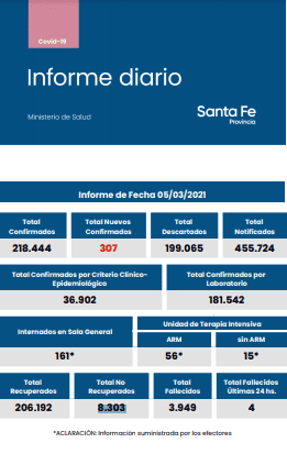 De esta manera, la cifra total de contagios desde el inicio de la pandemia llegó a 218.444 en Santa Fe y de los cuales 81.440 corresponden a la ciudad. Además, el reporte epidemiológico provincial informó que actualmente hay 8.303 pacientes activos, 161 internados en salas generale. y 71 en unidades de terapia intensiva.