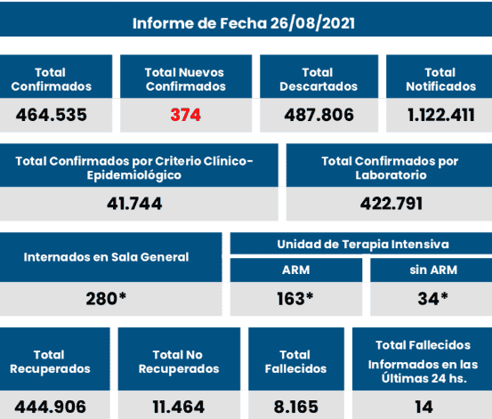 Con estas cifras, en Santa Fe ya se notificaron 464.535 contagios y 8.165 personas que fallecieron producto de la enfermedad. Además, el reporte epidemiológico informó que actualmente son 11.464 las personas que se encuentran transitando la enfermedad, 197 lo hacen en unidades de terapia intensiva y 280 en salas generales.