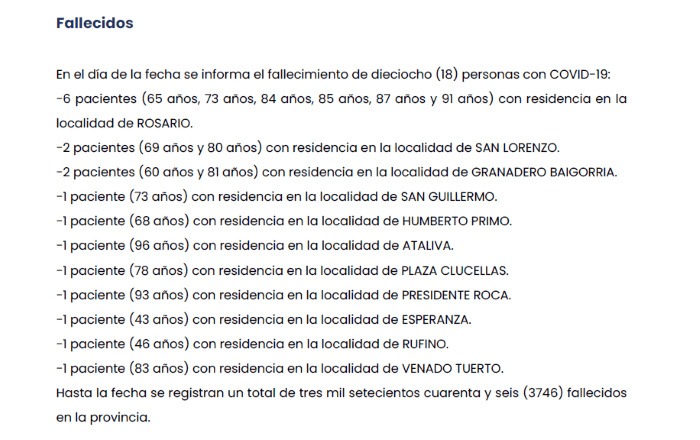 En cuanto al número de fallecidos durante las últimas 24 horas, la cifra fue de 18 personas, de las cuales 6 tenían residencia en la localidad de Rosario, dando un total de 1.931 decesos por covid-19 en la ciudad.