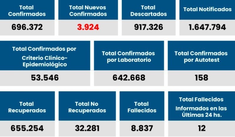 Según el parte diario del Ministerio de Salud de Santa Fe, en la provincia fueron 3.924 los contagios reportados oficialmente –con el acceso a los hisopados sólo para la población de riesgo– y 12 nuevas muertes de pacientes con covid.