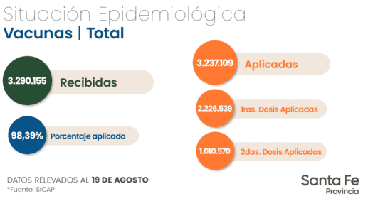 Con respecto a la campaña de vacunación, este jueves se aplicaron 31.976 dosis en Santa Fe. A la fecha ya hay 2.226.539 personas que iniciaron su esquema de vacunación y 1.010.570 que lo completaron.