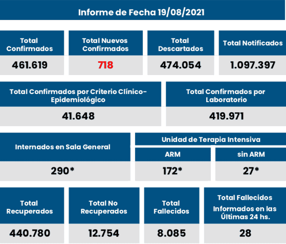 A nivel provincial, las cifras totales de personas que fueron confirmadas con la enfermedad llegaron a 461.619, mientras que en el reporte del día se informaron 28 decesos por lo que las muertes producto de la enfermedad se ubican en 8.085.