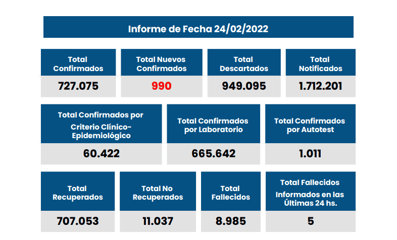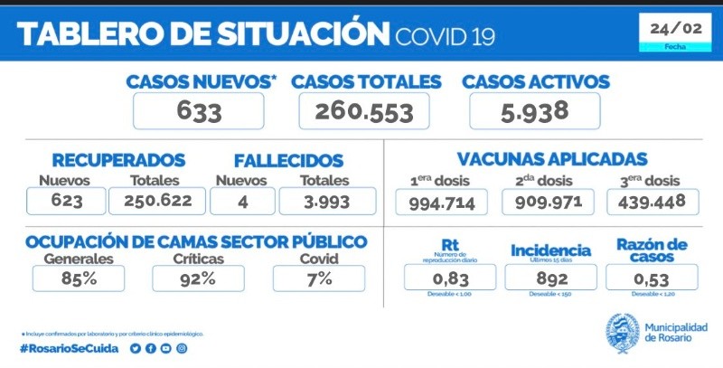 Este jueves 24 de febrero, el ministerio de Salud confirmó que se registraron 990 nuevos contagios de coronavirus y 663 en Rosario. Además, hubo 5 fallecidos durante las últimas 24 horas.