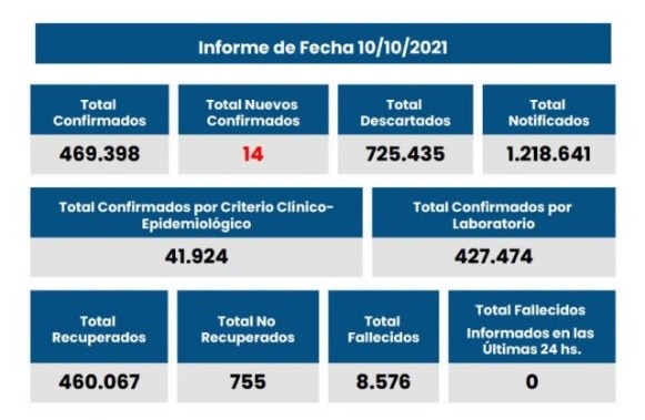 La cartera sanitaria no informó fallecimientos relacionados al covid-19 en la jornada. Hasta la fecha se registran un total de 8.576 fallecidos en la provincia.