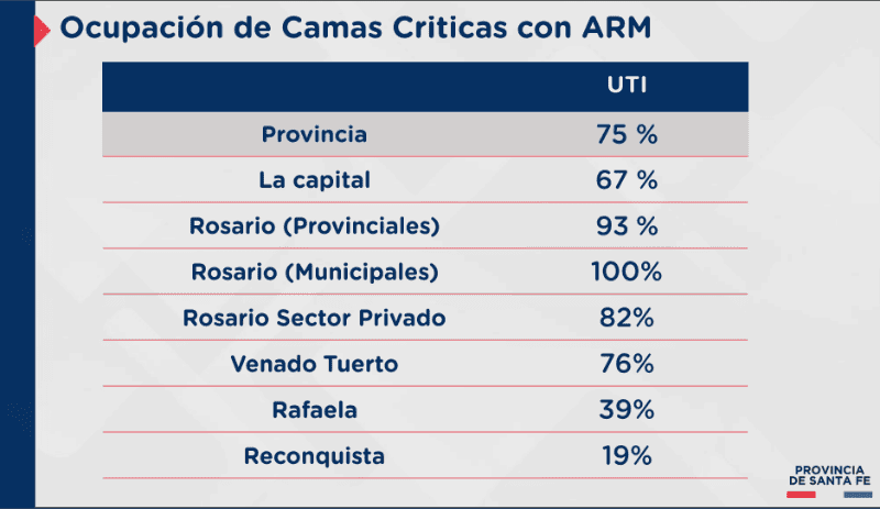 Si bien el porcentaje promedio de ocupación de camas de unidad de terapia intensiva (UTI) en toda la provincia era de 75%, en Rosario el nivel estaba al límite. El 100% de los espacios en hospitales municipales estaba en uso hasta este lunes a la noche, último reporte oficial conocido.