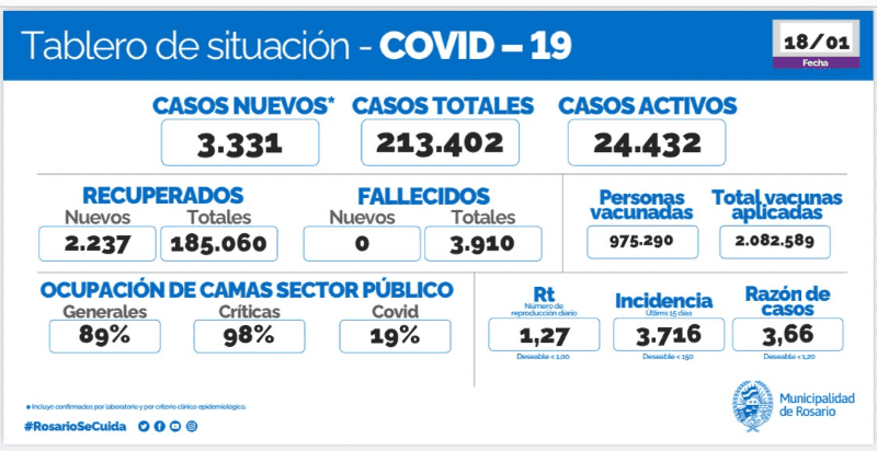 En el caso del sistema público de salud rosarino, la situación es distinta. La ocupación de camas generales informadas este martes fue de 89% y de críticas 98%. El porcentaje de pacientes covid subió al 19% (era de apenas 2% a principio de mes).