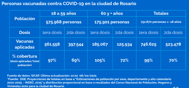 El 99% de las 746 mil personas mayores de 18 años en Rosario tienen la primera dosis aplicada y el 70% (523 mil) el esquema completo.
