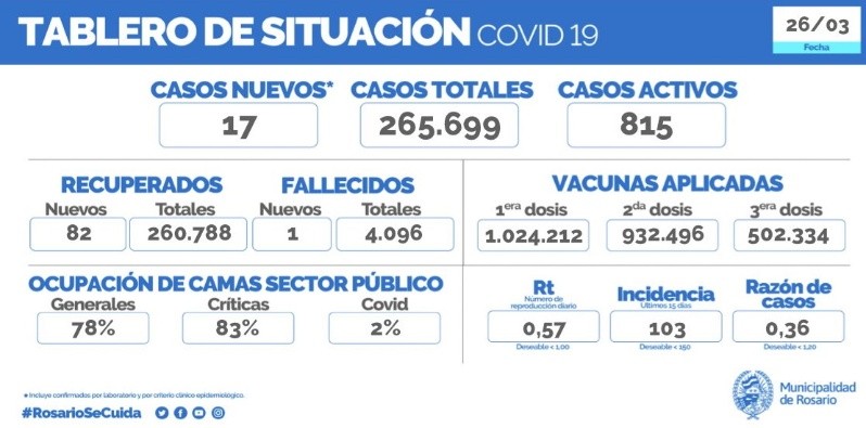 En Rosario, los positivos detectados subieron a 265.699 y se mantienen 815 activos.