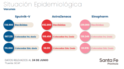 De acuerdo a los números oficiales, hasta el 24 de junio, en Santa Fe se inmunizaron 1.245.928 de personas. Este número representa cerca del 50% de la población en condiciones de vacunarse, de acuerdo a las estimaciones que tiene el gobierno provincial.