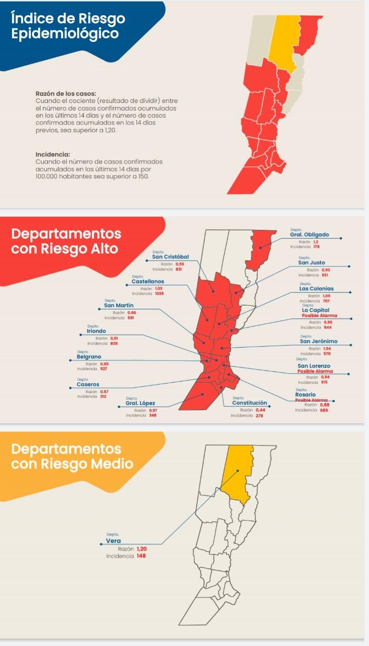 Desde el gobierno provincial indicaron que "los departamentos Rosario y La Capital entraron este lunes en la categoría Alarma Sanitaria, de acuerdo a la evaluación del Ministerio de Salud de Nación. Por lo tanto, se suspenderán las clases presenciales en todos los niveles, a partir de mañana, en dichos territorios". Luego de ese comunicado, la provincia agregó al departamento San Lorenzo a estas restricciones en el sistema educativo, al entrar también en la categoría de alarma sanitaria por la cantidad de contagios y por el colapso de las camas críticas en hospitales públicos y privados.