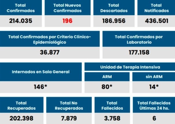 Con estas cifras, la provincia acumula 214.035 casos positivos desde el inicio de la pandemia y 3.758 personas que murieron con coronavirus.