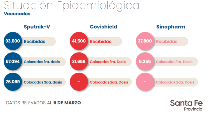 A Santa Fe, llegaron 93.600 del suero ruso, 41.500 del elaborado en la India bajo licencia de Oxford y AstraZeneca y 37.800 del laboratorio chino. De ese total de dosis, ya se aplicaron 121.104. De acuerdo al detalle que brindó la cartera sanitaria provincial, 95.005 corresponden al primer componente y 26.099 al segundo.