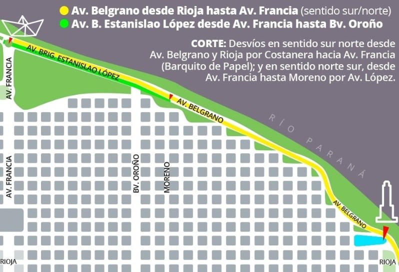 Agentes de la Secretaría de Control y Convivencia desarrollaron cortes y desvíos de tránsito entre las 13.30 y las 17.30 en sentido sur-norte desde avenida Belgrano y Rioja por Costanera hacia avenida Francia (Barquito de Papel), y en sentido norte-sur desde avenida Francia hasta Moreno por avenida Estanislao López.