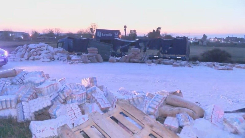 Cristian, trabajador de la grúa de Alvear, confirmó desde el lugar que el trabajo de limpieza de la calzada llevará al menos tres o cuatro horas. También vecinos de la zona aprovecharon a llevarse la mercadería desparramada por la calzada.