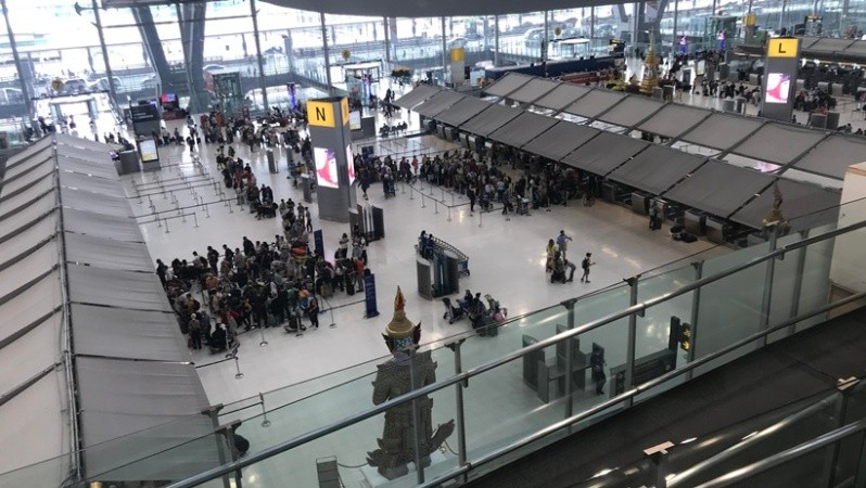 El día indicado fui con todo al aeropuerto Suvarnabhumi de Bangkok y un mundo de gente intentaba atravesar controles. El termómetro infrarrojo con forma de pistola me apuntó a la cabeza y marcó una líneas por encima de 36.