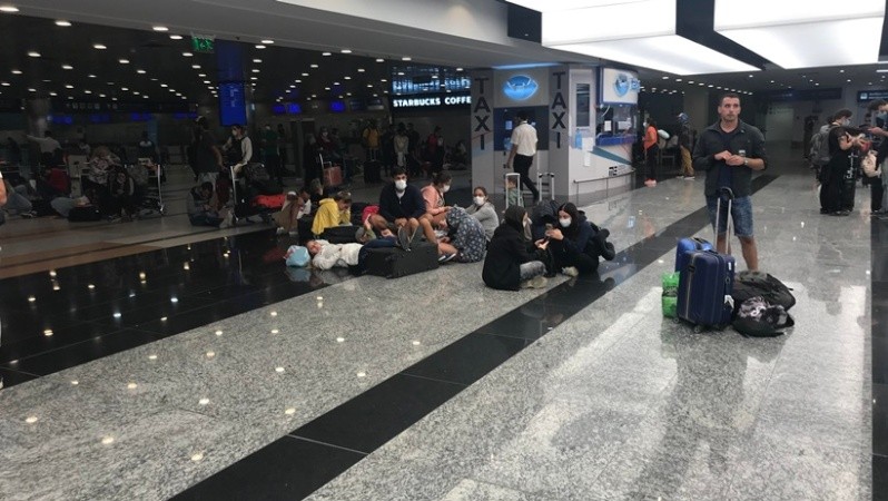 En cada rincón se fueron juntando viajeros llegados durante el día en vuelos autorizados. Algunos pasajeros vencidos por el sueño pusieron los bolsos como almohada y pudieron dormir en medio del ruido. Varios buscaban enchufes libres para poner a cargar celulares y anunciar el arribo a la familia.