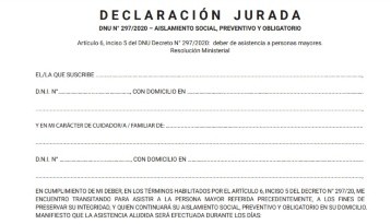 El formulario también indica que "los progenitores, por razones laborales que se inscriban en las tareas exceptuadas por el decreto presidencial o de asistencia a terceros u otras causas de fuerza mayor "deba ausentarse del hogar en el que se encuentra el niño, niña o adolescente; pueda trasladarlo al domicilio del otro progenitor, familiar o referente afectivo".