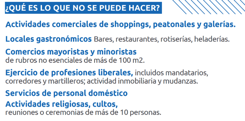Desde la hora cero de este sábado 19 y por una semana más, en los departamentos Rosario, San Lorenzo, Constitución, Caseros y General López, seguirán vedadas las actividades comerciales (shoppings y galerías), la atención presencial en locales gastronómicos (solo con delivery y take away), los comercios mayoristas y minoristas, el servicio doméstico y actividad de profesionales.