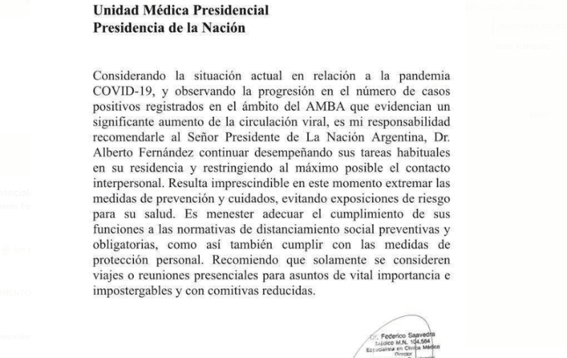 "Es mi responsabilidad recomendarle al Señor Presidente de La Nación Argentina, Dr. Alberto Fernández continuar desempeñando sus tareas habituales en su residencia y restringiendo al máximo posible el contacto interpersonal”, sostiene en un comunicado el director de la Unidad Médica Presidencial, Federico Saavedra.
