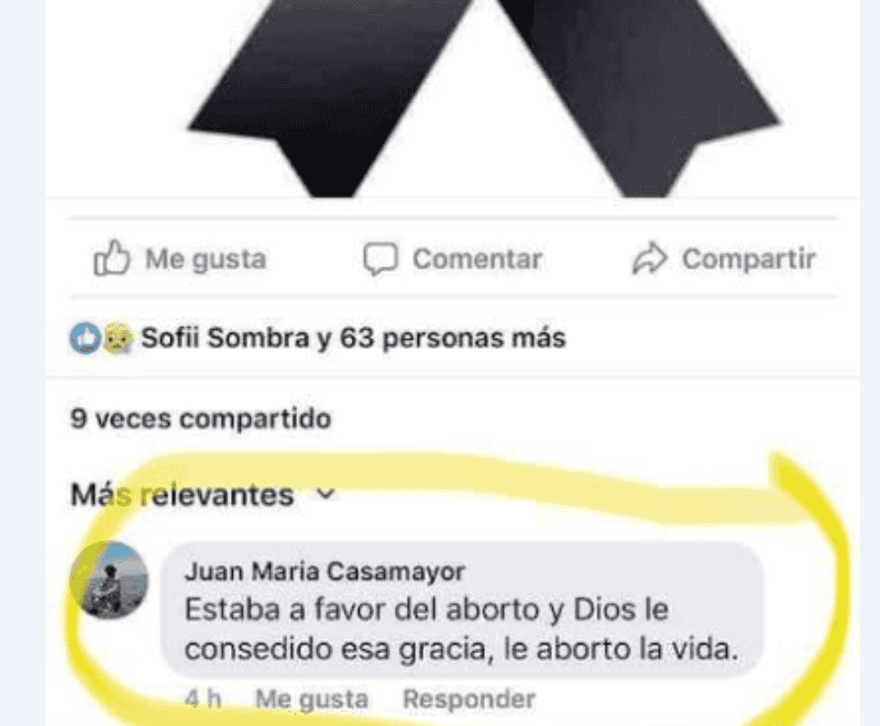 El sacerdote que realizó el posteo es Juan Casamayor, quien comentó: “Estaba a favor del aborto y Dios le consedio (sic) esa gracia, le abortó la vida”.
