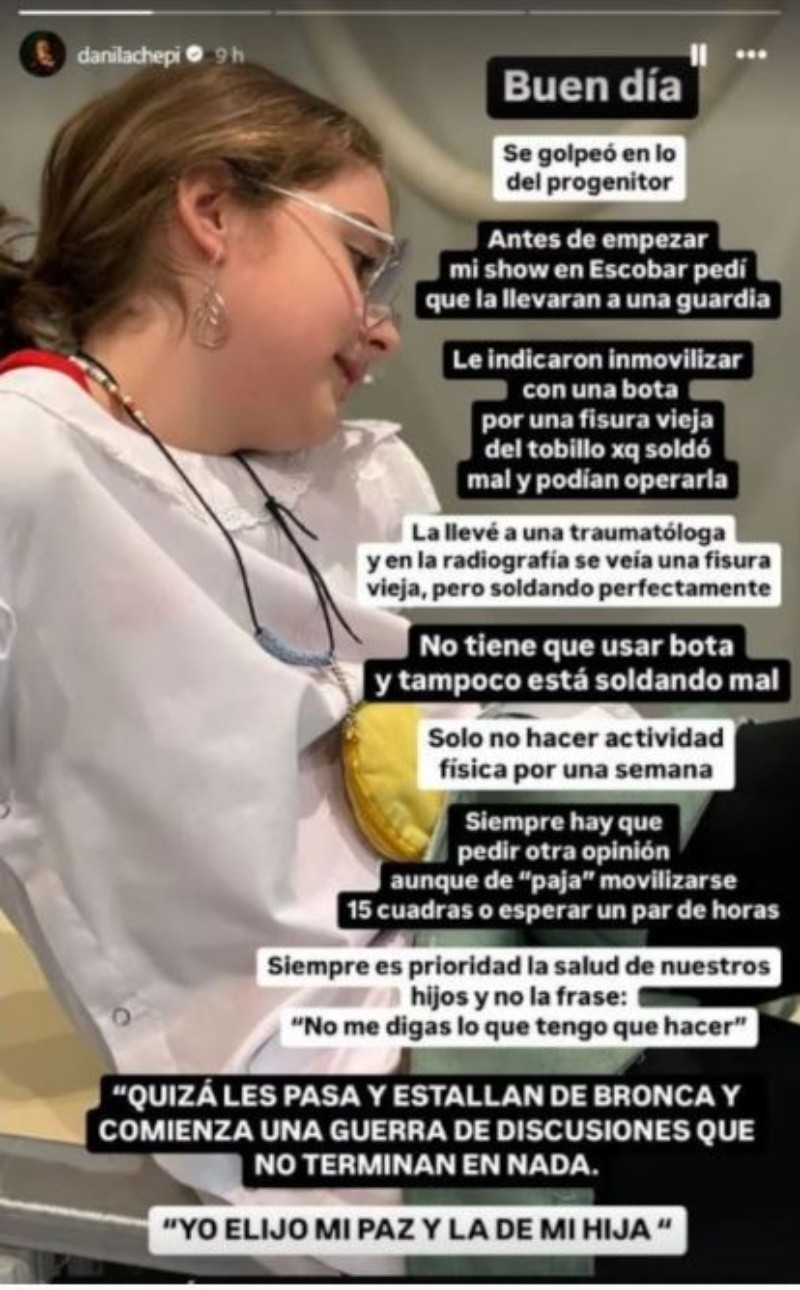 En la publicación se puede ver a la nena sentada sobre una camilla. “Se golpeó en lo del progenitor. Antes de empezar mi show en Escobar, pedí que la llevaran a una guardia”, explicó la humorista. Y agregó: “Le indicaron inmovilizar con una bota por una fisura vieja del tobillo porque soldó mal y podían operarla”.