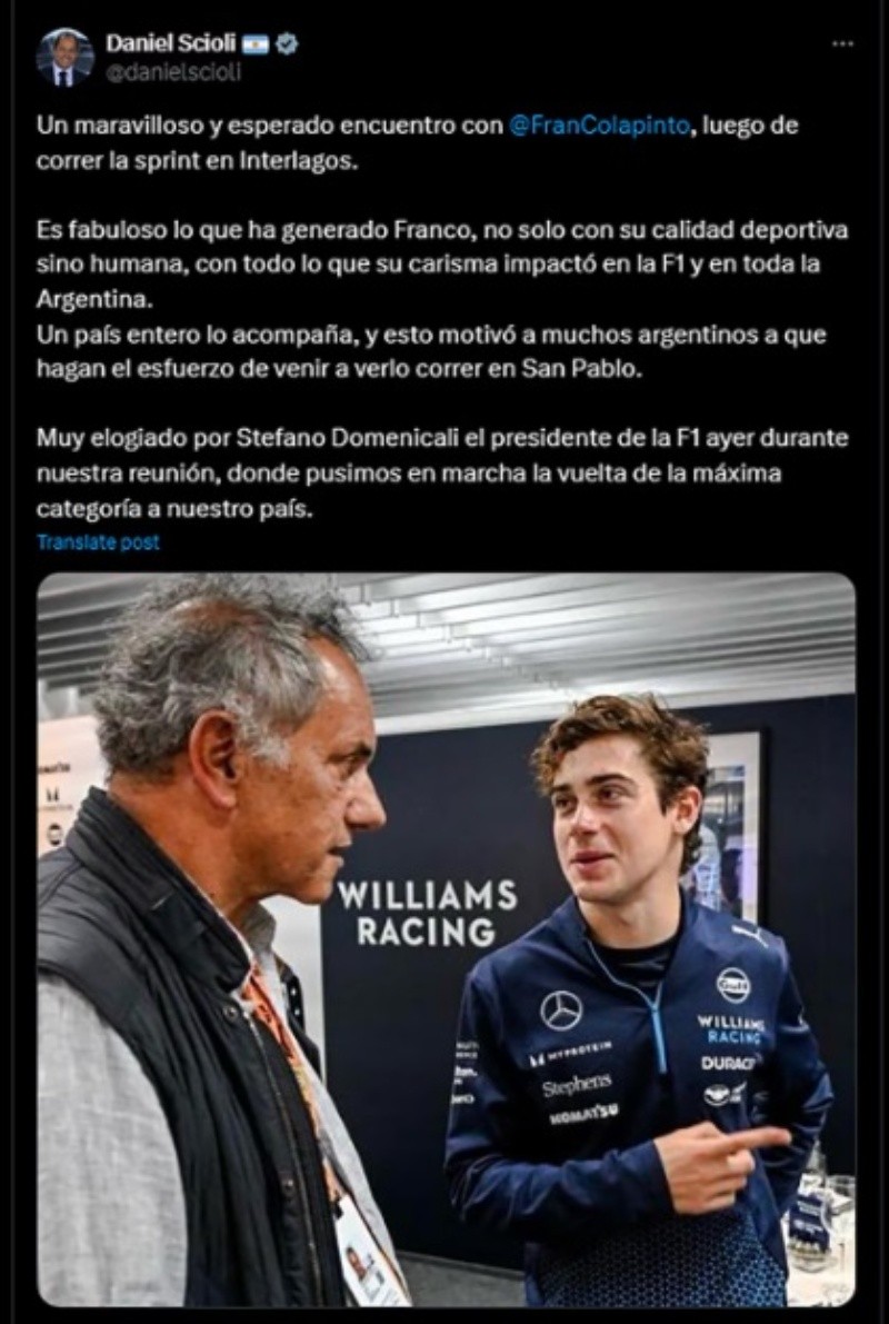 "Es fabuloso lo que ha generado Franco, no solo con su calidad deportiva, sino humana, con todo lo que su carisma impactó en la F1 y en toda la Argentina. Un país entero lo acompaña, y esto motivó a muchos argentinos a que hagan el esfuerzo de venir a verlo correr en San Pablo", escribió el funcionario en sus redes sociales.