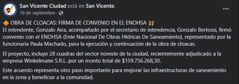 En el mes de septiembre, Aira firmó un convenio con el ENOHSA (Ente Nacional De Obras Hídricas De Saneamiento) por un monto de $159.756.268,30 con el fin de completar la ejecución y continuación de la obra de cloacas en las 28 cuadras que aún no las tienen. La duda que le surgió al mandatario sanvicentino luego del domingo es ¿qué pasará con ese monto que ya se había asignado?