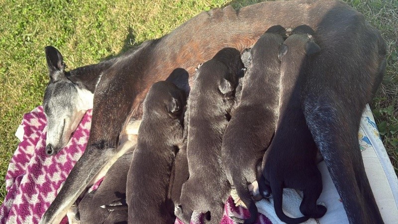 Fue en junio, en pleno invierno, que Albertina fue acogida por Priscila en su hogar, en Roldán. La galga llegó a la casa acompañada. De sus tetas hinchadas de leche mamaban 9 miniaturas de sí misma. “Subieron una publicación de ella en un campo en Ramallo con sus cachorritos de dos o tres días. Hacía frío y estaban así, a la deriva”, recordó Priscila sobre la primera vez que vio a la perra galgo.