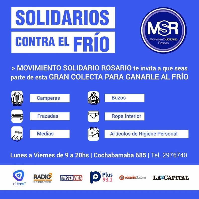 Se trata de la iniciativa "Solidarios contra el frío", una colecta promovida por la ONG Movimiento Solidario Rosario y Grupo Televisión Litoral para ayudar a personas en situación de calle. De lunes a viernes, de 9 a 20, se reciben camperas, buzos, frazadas, medias y ropa interior en condiciones, además de artículos de higiene personal, en calle Cochabamba 685.