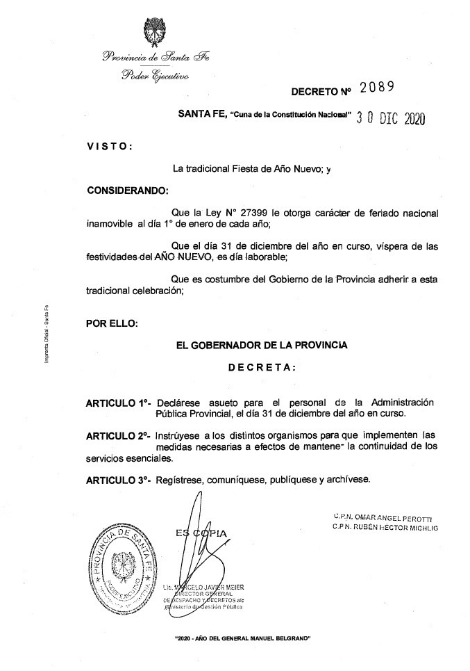 A través del decreto Nº 2089, firmado por el gobernador Omar Perotti, el Ejecutivo contempló “que es costumbre del gobierno de la provincia adherir a esta tradicional celebración” de fin de año, además del feriado inamovible del 1º de enero.
