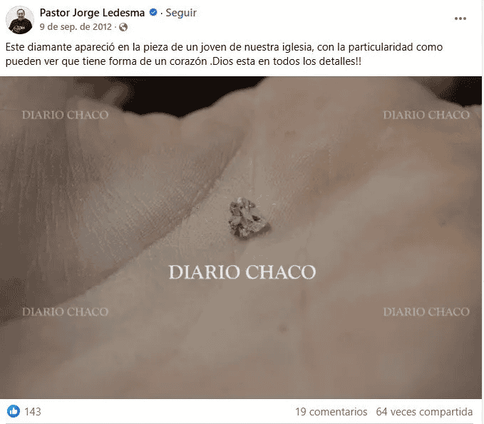"Este diamante apareció en la habitación de un joven de nuestra iglesia y, como pueden ver, tiene la particularidad de tener forma de corazón. Dios está en todos los detalles", señaló en una de sus publicaciones.