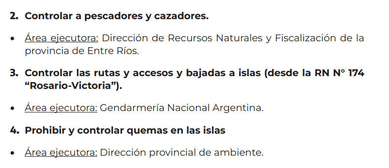 En el primer grupo, se destacan los “patrullajes preventivos”, “controlar a pescadores y cazadores” y “las rutas, accesos y bajadas a islas (desde la ruta nacional N° 174 “Rosario-Victoria”), a realizar entre fuerzas entrerrianas, Prefectura y Gendarmería.