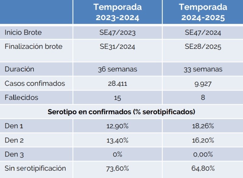La circulación viral se interrumpió después de 16 semanas con menor cantidad de casos totales (un 65% menos) y de defunciones. Fue similar la presencia de serotipos, con predominio de DEN-1 y DEN-2.