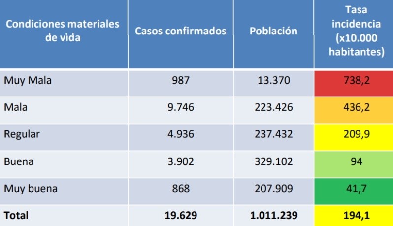 Uno de los puntos sensibles al comparar los datos de ambos brotes están ligados al vínculo con las condiciones materiales de vida. El año pasado, las tasas de incidencia fueron mayores en personas con condiciones de vida materiales más desfavorables.