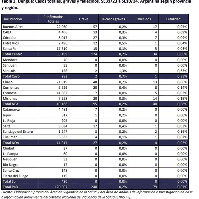 Según el último Boletín Epidemiológico Nacional, desde la semana 31 de 2023, fines de julio y principios de agosto, hasta la semana 10 de 2024, principios de marzo, "se registraron 120.007 casos de dengue". Según precisaron, 109.313 sin antecedentes de viaje (autóctonos), 3.917 importados y 6.777 en investigación, resultando en una incidencia acumulada hasta el momento a nivel país de 255 casos cada cien mil habitantes".