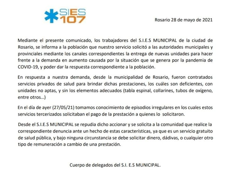 Trabajadores del Sistema Integrado de Emergencias Sanitarias (Sies) realizaron un comunicado en el cual, además de repudiar la precariedad con la que trabajan y que pone en riesgo a los trabajadores y a los pacientes atendidos, denuncian que los servicios privados que fueron contratados para suplantar los rotos cobran un adicional, el cual no está permitido.