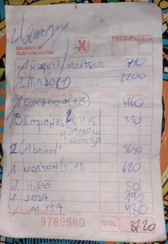 Fuentes del sitio de El Trece, a través de las redes, Andrea Arrozpide publicó el resumen de la cuenta realizado a mano por los mozos, de acuerdo con la información que publicó La Estefata Online, y señaló: “Hola gente linda: aquí comparto algo que me sucedió hoy por la noche. Fui a cenar a ‘Fogón Criollo’ y esta es la cuenta que aboné. La comparto para que piensen antes de ir hasta este lugar ¡Te cobran casi hasta por respirar! Éramos tres adultos 7 dos menores. $8.720. Y encima la cuenta es incorrecta...”.