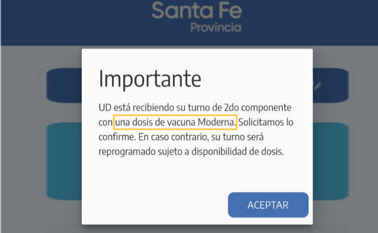 "Usted está recibiendo su segundo turno de 2do componente con una dosis de vacuna Moderna. Solicitamos lo confirme. En caso contrario, su turno será reprogramado sujeto a disponibilidad de dosis", señala el texto enviado desde el viernes a quienes fueron inoculados con Sputnik en abril.