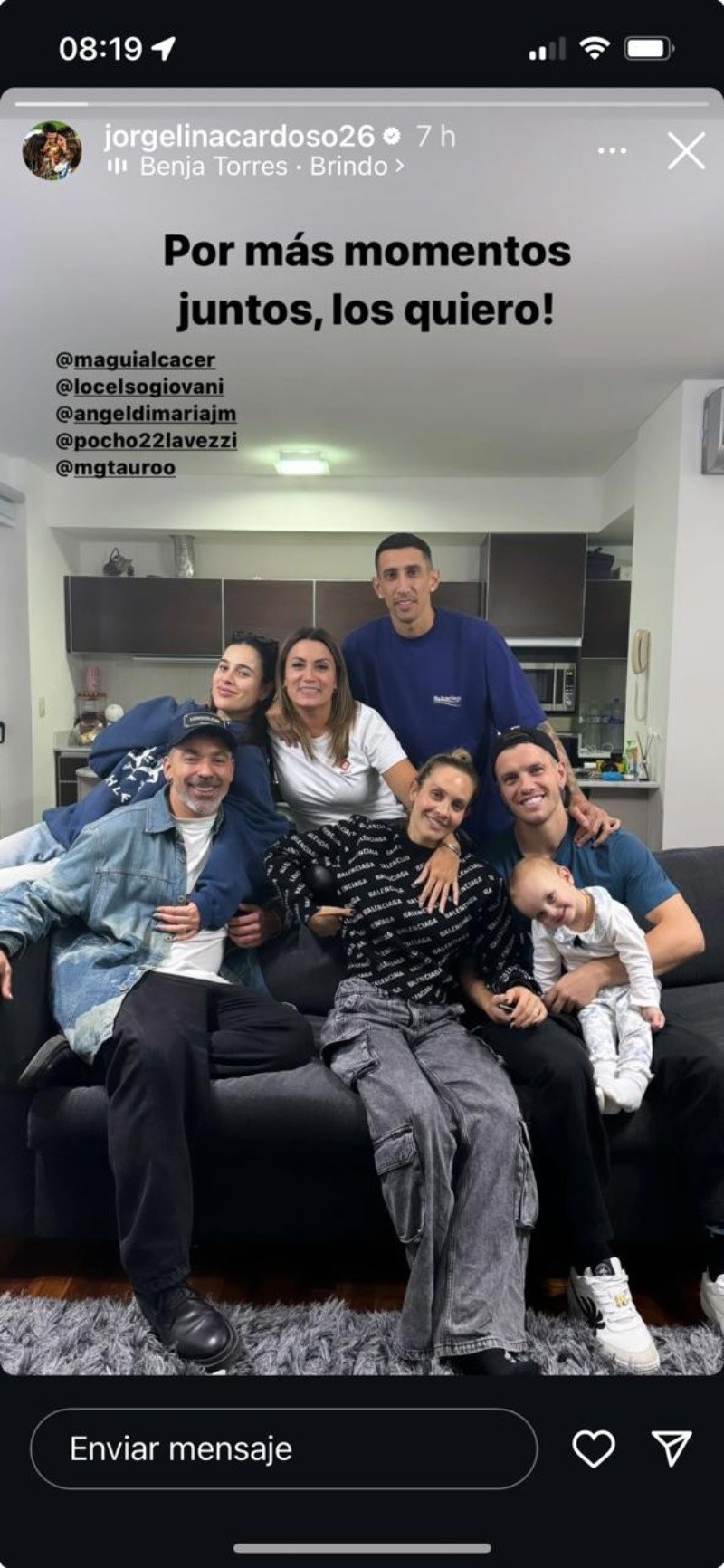 "Por más momentos juntos, los quiero", escribió Jorgelina en la historia de Instagram que grafica un momento feliz del matrimonio y sus amigos durante sus vacaciones en Rosario, antes de volver a Portugal, donde Di María firmó un contrato por un año más con el Benfica.