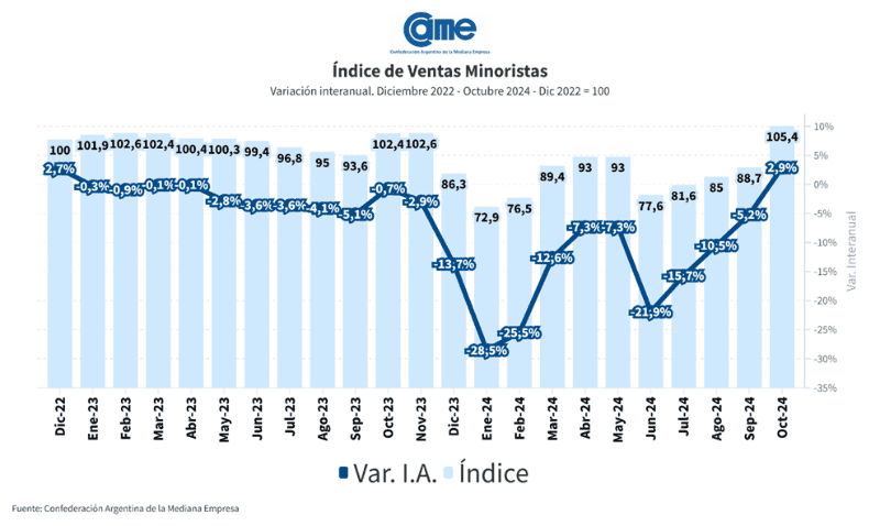 El Índice de Ventas Minoristas Pymes de la Confederación Argentina de la Mediana Empresa es elaborado en base a un relevamiento mensual entre 1.300 comercios minoristas del país, realizado el 1º y el 2 de noviembre.