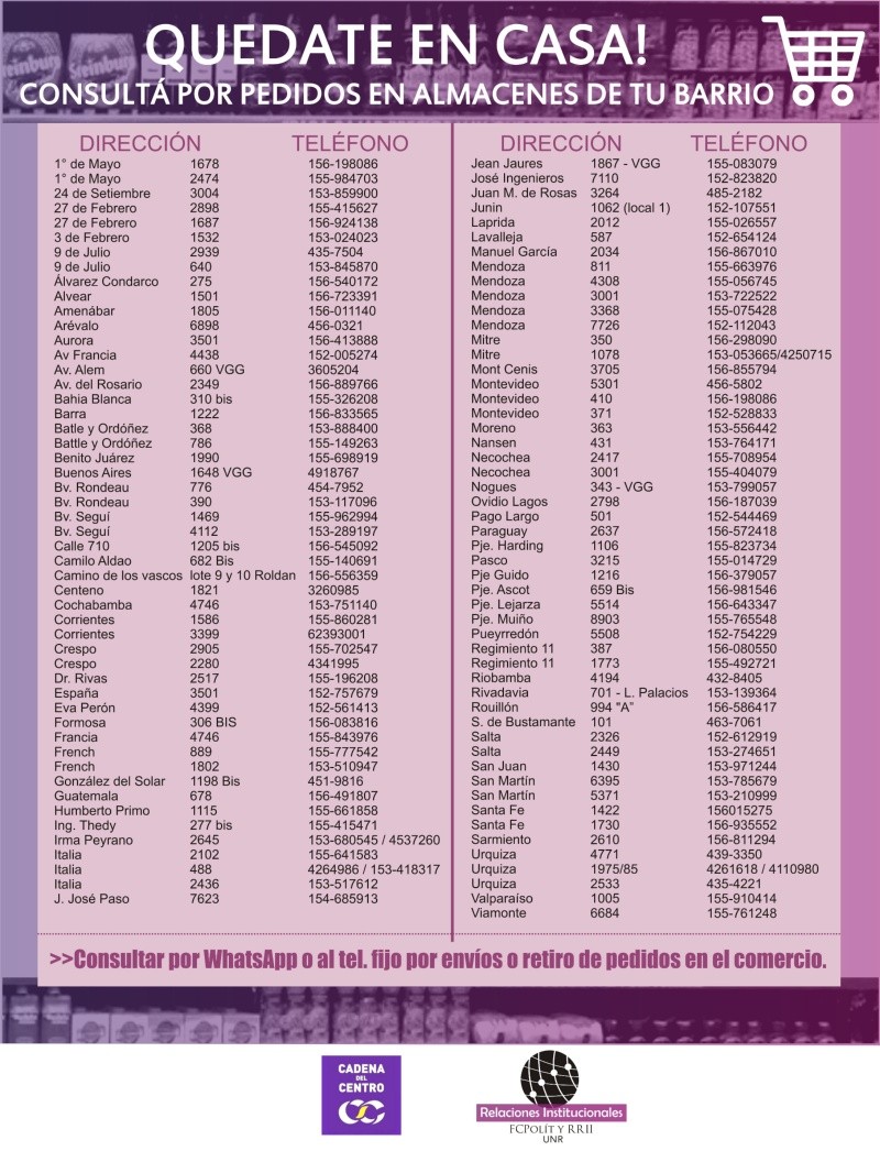 La facultad de Ciencia Política de la Universidad Nacional de Rosario (UNR) y la Unión de Almaceneros de Rosario dieron a conocer un mapa online con 120 almacenes donde se puede comprar en épocas de aislamiento social preventivo obligatorio y cuarentena, en el Gran Rosario. Cada punto tiene la dirección y el teléfono del local para solicitar envío a domicilio o hacer un pedido y retirarlo sin demoras cuando esté listo.