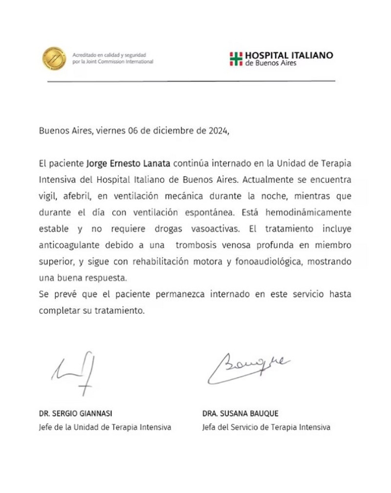 El el último parte difundido se detalló que "el paciente Jorge Ernesto Lanata continúa internado en la Unidad de Terapia Intensiva del Hospital Italiano de Buenos Aires", en donde "actualmente se encuentra vigil, afebril, en ventilación mecánica durante la noche, mientras que durante el día con ventilación espontánea". Además, indicaron que "está hemodinámicamente estable y no requiere drogas vasoactivas".