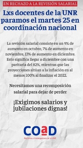 Junto a otras organizaciones de base de todo el país, los docentes de la UNR decidieron ir al paro en “clara disconformidad” con la paritaria firmada por Conadu. “Exigimos salarios y jubilaciones dignas, necesitamos una recomposición salarial para dejar de perder”, expresaron mediante un comunicado.