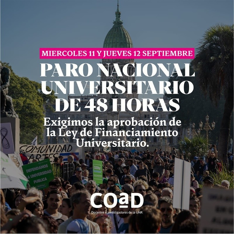Los docentes de la Universidad Nacional de Rosario (UNR) nucleados en el gremio Coad volverán a las medidas de fuerza esta semana con un paro de 48 horas los días miércoles 11 y jueves 12 de septiembre, según informó el consejo directivo y el congreso de delegados del sindicato de profesores.