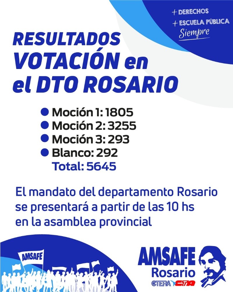 Esa postura consiguió la mayoría de las adhesiones de los maestros rosarinos (3255 de los 5645 que votaron). Mientras que la segunda moción que sumó más adeptos fue la de avanzar en jornadas semanales de protesta con movilizaciones departamentales, regionales y provinciales.