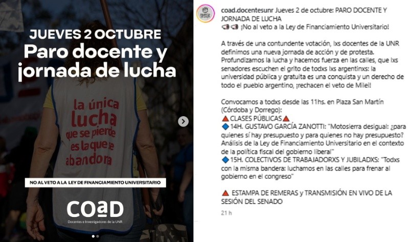 "¡No al veto a la ley de Financiamiento universitario!", es la consigna del paro de este jueves según comunicó Coad en sus redes sociales, donde además confirmaron "la contundente votación" a favor de la medida de fuerza.