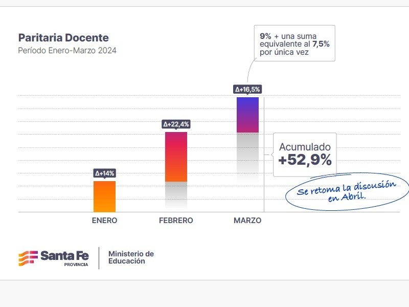El ministro de Educación, José Goity, dijo en cambio que el gobierno provincial hizo “un esfuerzo importante”. “El viernes se termina de pagar el 22,4 por ciento del cierre de 2023 y ofrecimos un 9 por ciento de recomposición y 7,5 por ciento más como aporte compensatorio”, dijo el funcionario. “Ningún docente va a cobrar menos de $50.000 de aumento”, añadió. Pidió que más allá de lo que opinen los dirigentes gremiales quiere “ver qué opinan los docentes santafesinos y que haya una propuesta de aceptar entre las mociones”. “Hacemos esta propuesta para volver a discutir en abril sin rechazar esta oferta. Faltan 15 días para abril”, dijo Goity y pidió que se garantice la presencia de los chicos en clases. Para la gestión santafesina se trata de un aumento del 16,5% para marzo (conformado por un 9% más un 7,5% de manera extraordinaria y por única vez) y que se completa con el incremento otorgado en enero (14%) y en febrero (22,4%) -este último a abonarse por planilla complementaria este viernes-. "De esta manera, si la propuesta es aceptada, los docentes santafesinos van a cobrar de bolsillo un 52,9% en marzo más que en diciembre pasado", sostuvo la administración santafesina. El detalle de números del Gobierno