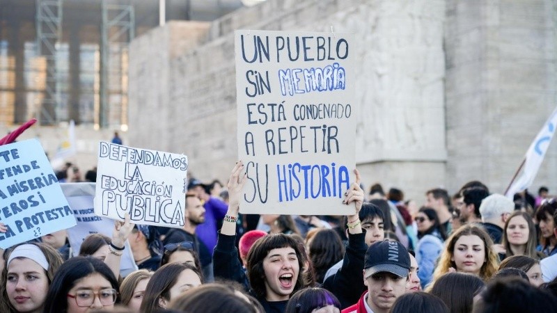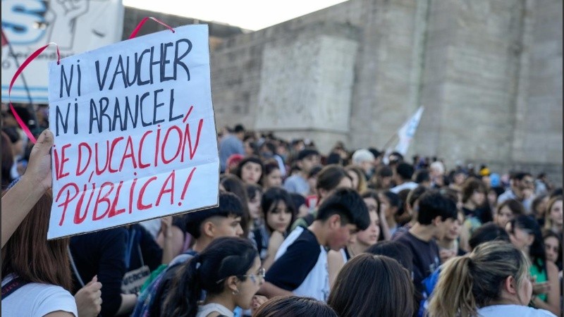 Pasadas las 16, docentes, estudiantes, gremios y organizaciones sociales y políticas comenzaron a marchar desde plaza San Martín hasta el Monumento Nacional a la Bandera bajo la consigna “Ni voucher, ni arancel: salarios dignos y presupuesto educativo”, en oposición al cambio estructural en educación que propone el candidato a presidente por La Libertad Avanza, Javier Milei.