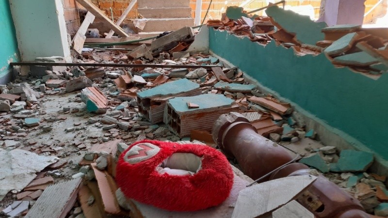 Más allá, por Cabal, quedó un mueble quemado, un par de pantuflas rojas con la M de Mario Bros, una carpeta de la escuela secundaria con sus hojas abiertas. El resto son escombros, ladrillos, vidrios y materiales quemados entre las paredes en pie. Esto que cruje debajo de los pies fue una casa antes del torbellino de manos que la devoró.