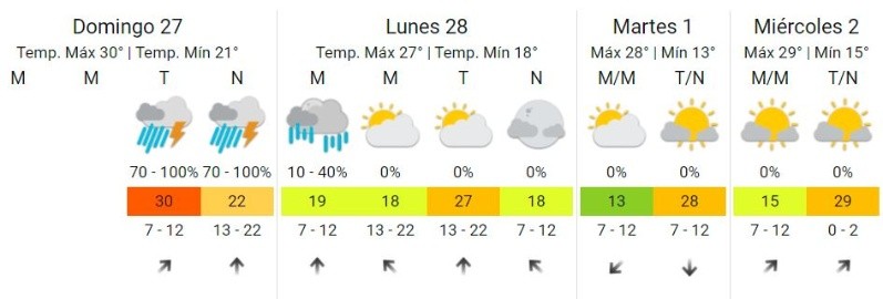 Las condiciones de inestabilidad se mantendrían hasta las primeras horas de este lunes y comenzarían a mejorar desde el mediodía. Para esa jornada de feriado se espera una mínima de 18º y una máxima de 27º, mientras que el martes estaría mayormente soleado con una máxima prevista en 28º.